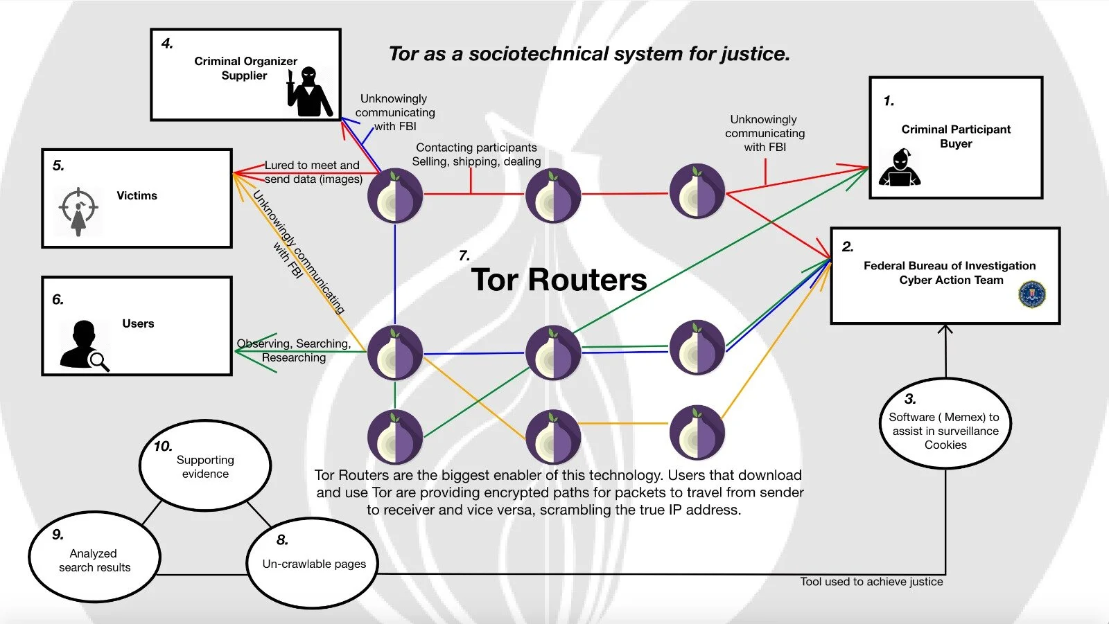 Action: De-blackbox The Onion Router (Tor’s) technology and analyze how it is used by the Federal Bureau of Investigation to find criminals and conduct investigations on the Dark Web.